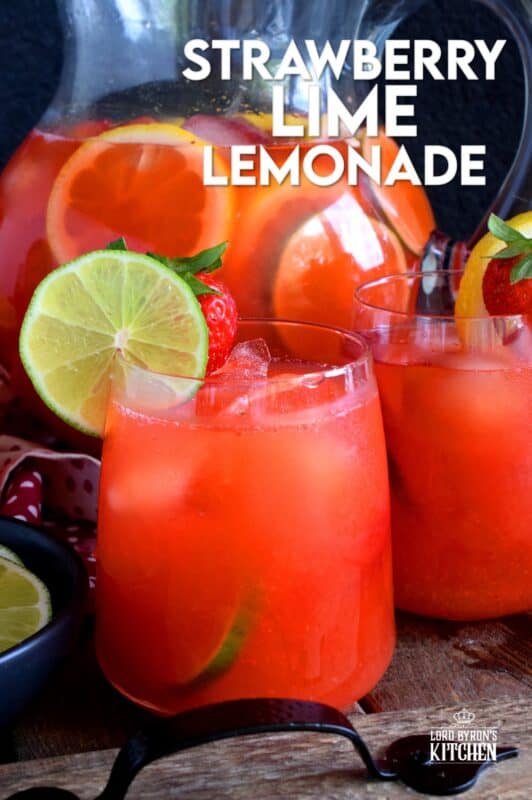 I would not recommend adding any of the fruit garnish to the pitcher while you’re waiting for the Strawberry Lime Lemonade to cool in the fridge. I would also not add in any ice. The ice will obviously melt and dilute the flavour of the lemonade. And adding the garnish will change the flavour as well. The lemon and lime slices particularly will add more acid to the lemonade and possibly make it too tart and throw off the balance.