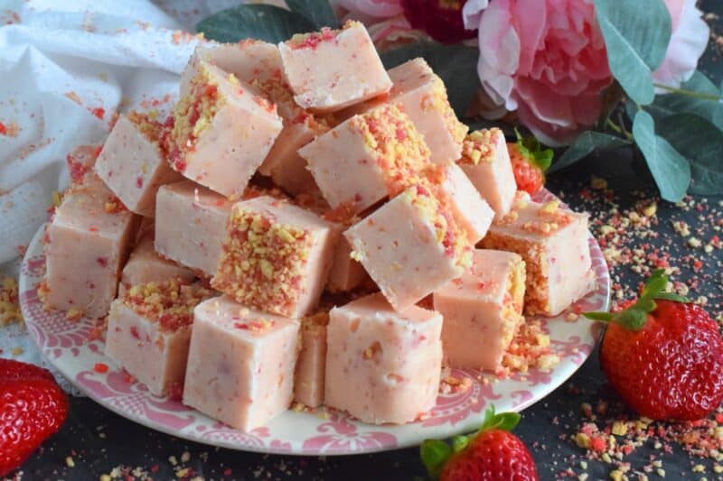 Add in Strawberry Shortcake Crumbs. Stir until well combined. Transfer the mixture to the prepared baking pan and use your spatula to flatten and push it down into the pan, being sure to get into the corners too. Top with more Strawberry Shortcake Crumbs. You can set the pan aside for 3-4 hours until the fudge is firm enough to cut into pieces, or you can speed up the process by refrigerating it for 1 hour. Once firm, cut into 1-inch cubes. Store in a food-safe container in your fridge.