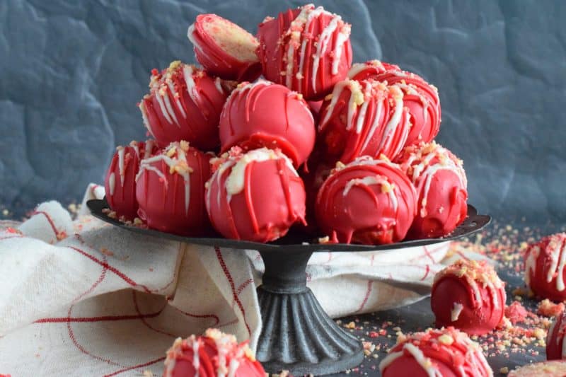 Prepared with crushed vanilla-flavoured Golden Oreos, cream cheese, and homemade strawberry shortcake crumbs, these Strawberry Shortcake Truffles are dipped in melted red candy melts and drizzled with white melted chocolate. They’re beautifully bold and bright, and delicious too!