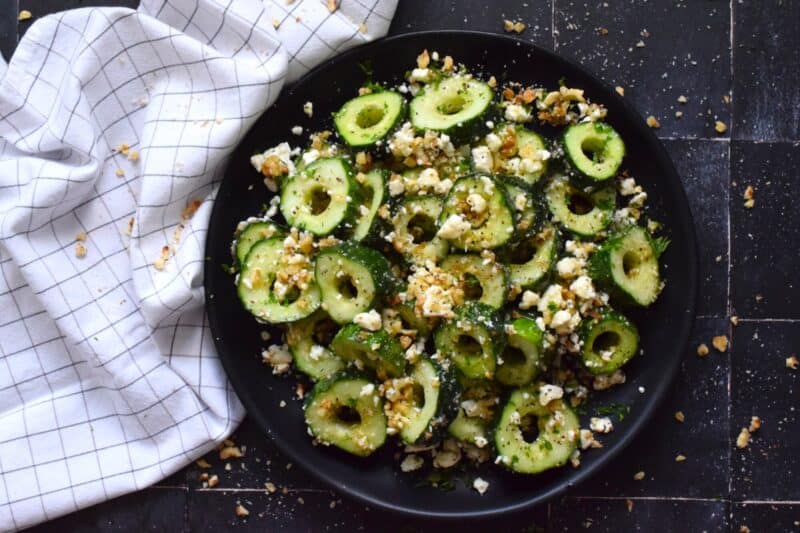 A great side or a refreshing snack, Sweet and Salty Cucumber Rings are the result of summer fresh cucumbers being paired with toasted pecans, crumbled feta, and lots of drizzled honey. Serve at room temperature immediately after preparing for the best results!