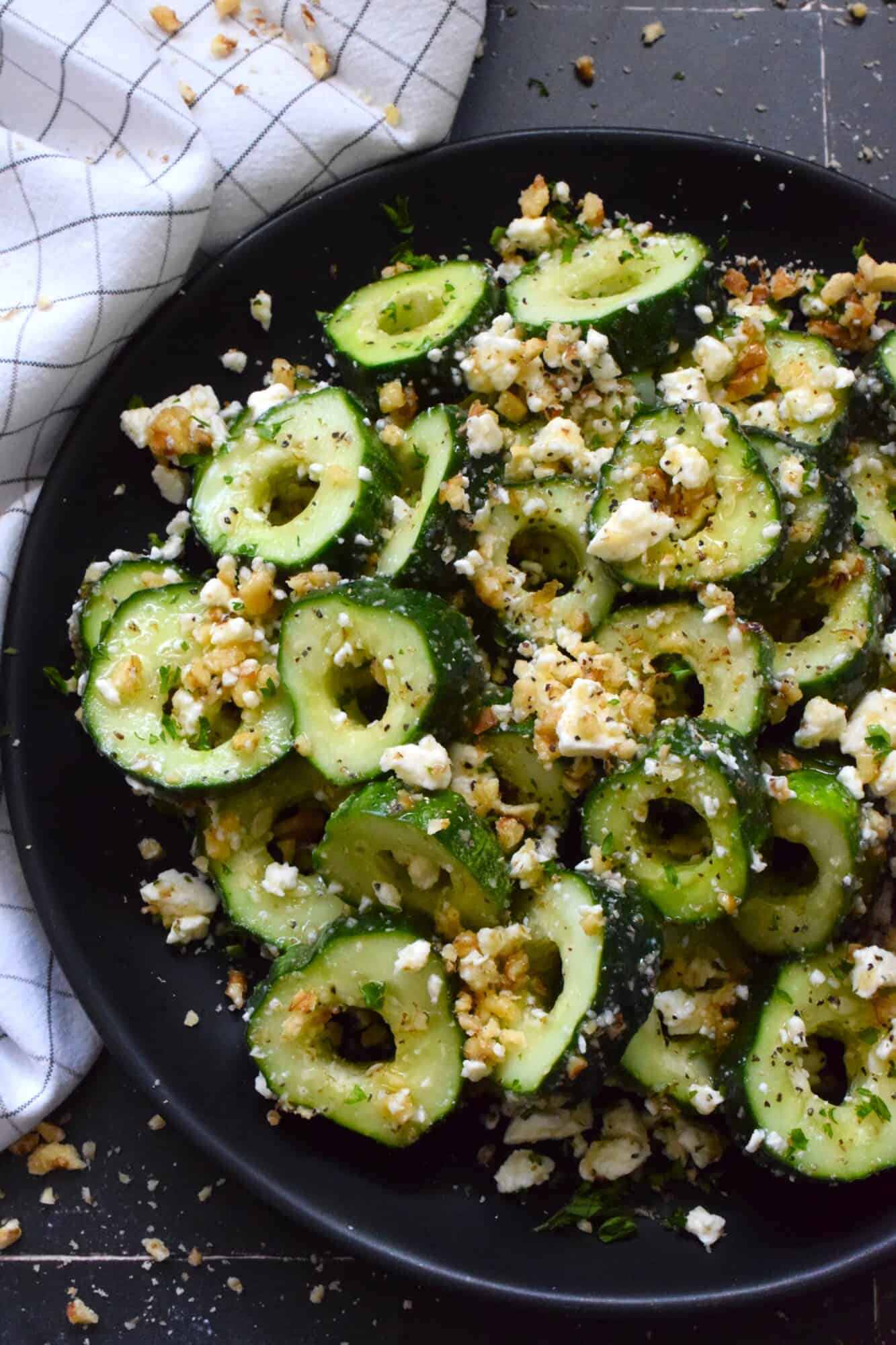 A great side or a refreshing snack, Sweet and Salty Cucumber Rings are the result of summer fresh cucumbers being paired with toasted pecans, crumbled feta, and lots of drizzled honey. Serve at room temperature immediately after preparing for the best results!