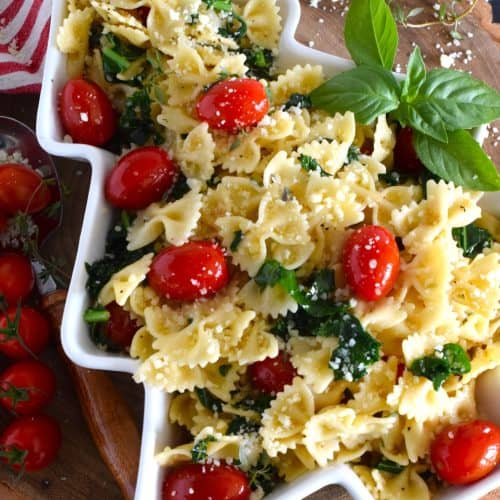 The combination of bright red cherry tomatoes and the forest green colour of sauteed kale come together to make this 30 Minute Holiday Pasta! Perfectly cooked pasta is tossed in a salted butter and garlic sauce with aromatic herbs - simple and delicious!