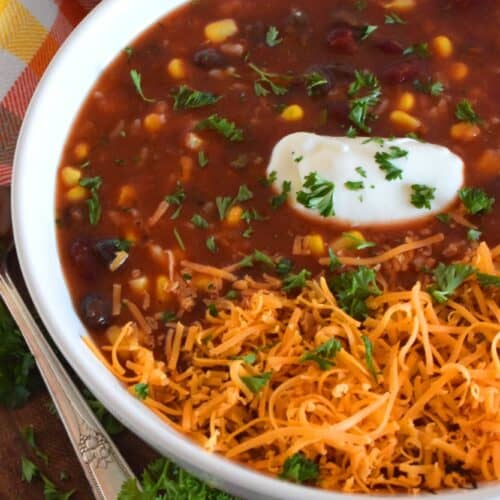 With the help of taco seasoning, canned beans and corn, and some leftover rice, 30 Minute Taco Soup comes together quickly and easily. Make it even better by topping it with cheese, and sour cream!