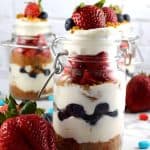 Fresh blueberries and strawberries, with their crisp red and blue colours, paired with the perfect cream cheese whipped cream, makes the most lovely 4th of July Cheesecake in a Jar!