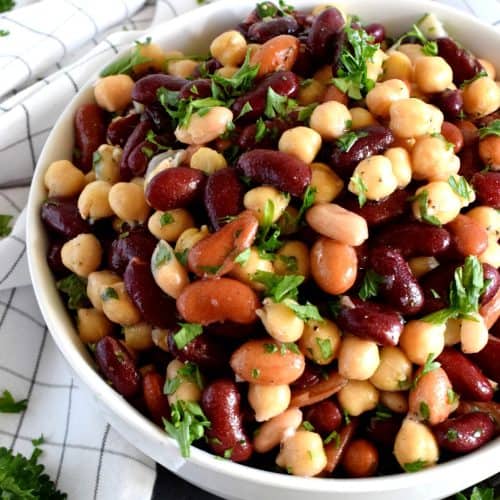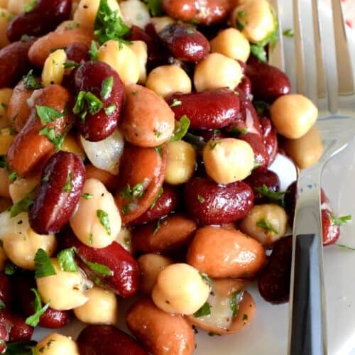 A quick, delicious, and hearty salad that's perfect for any occasion! This 5 Minute Bean and Chickpea Salad will pair well with anything you serve at a picnic, backyard barbecue, or local church potluck! A tangy and savoury salad this good and this inexpensive is a keeper for sure!