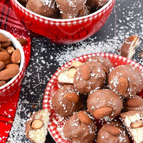 These Almond Joy Truffles taste exactly like an Almond Joy Chocolate Bar! They are so easy to make and have few ingredients. For the serious coconut lover, these truffles are perfectly sweet with a chewy center and a little almond crunch!