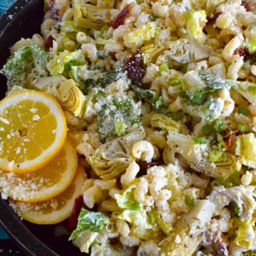 Prepared with pasta, lettuce, canned artichokes, chopped sun dried tomatoes, onions, and parmesan, this salad can be a delicious side or a complete meal! The hot and hazy days of summer are just weeks away, so save this recipe now for your backyard barbecues and those family picnics!