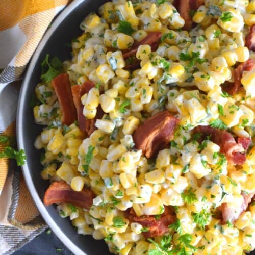 Serve this Bacon and Corn Salad warm as a side to your favourite summer grilled mains. Loaded with fried bacon, bright yellow corn, and fresh green onions, this salad is tossed with a kicked-up mayonnaise-based dressing. Can be prepared ahead of time too and just lightly reheated through just before serving!