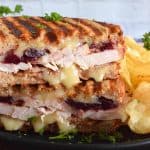 Stuffed to the max with sliced turkey, crispy bacon, and cranberry sauce, this Bacon and Turkey Panini is very moist and juicy. Oh, and it's also loaded with melted, gooey cheese! This sandwich is the best way to use up your Thanksgiving leftovers! If you don't have a panini press, don't worry; I have a solution!
