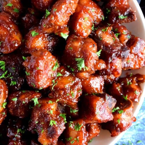 Perfectly baked, these fork-tender, fall-off-the-bone pork riblets, in a thick homemade barbecue sauce, couldn't get any easier! Do you remember when these used to be popular at buffet restaurants? This is a copycat version you can make at home!