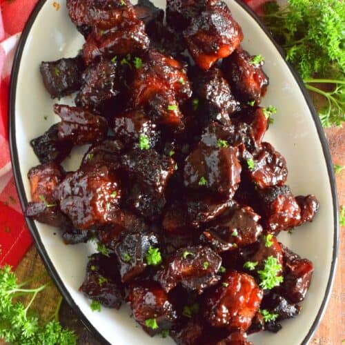 Barbecued Smoked Pork Belly Burnt Ends are prepared with trimmed and cubed pork belly which has been dry rubbed with a sweet spice blend. The pork is smoked with apple wood before being tossed with sauce and returned to the smoker to char up.