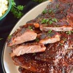 Bourbon Barbecue Pork Ribs are fall-off-the-bone tender. They are slow baked in the oven and basted with a thick and glossy, spicy and sweet, partially homemade bourbon barbecue sauce. Half a rack per person sounds right, yes!?