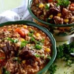 A slow Braised Beef Stew with Rice is not a typical beef stew, but it’s absolutely delicious nonetheless. Loaded with tender chunks of beef, and carrots, peppers, celery, corn, and rice, this stew is perfect anytime!