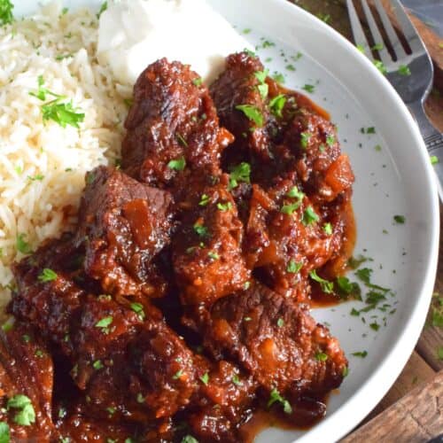 Place a lid on the pot and reduce the heat to simmer. Simmer for 2 hours, checking every 30 minutes to see if the liquid has not evaporated too much. The sauce will reduce and thicken, but should never be lower than an inch in the pot. If the liquid evaporates too much, add enough water to bring it up to the one-inch level. Once done, the beef will be very tender.