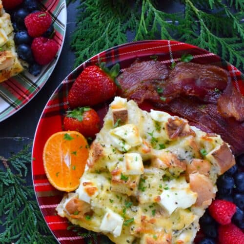 When ready to bake the next morning, remove the baking dish from the fridge and allow it to rest at room temperature for 15 minutes while you preheat your oven to 350 degrees F.