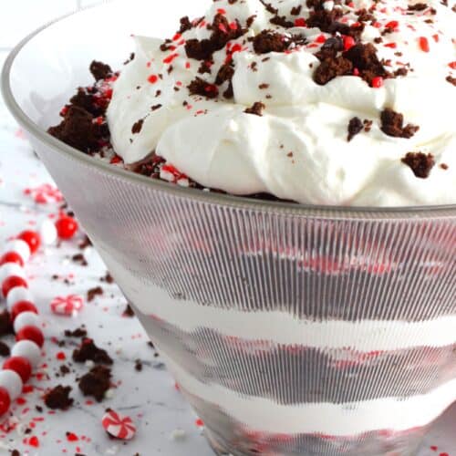 Prepared with two-bite brownies, decadent whipped cream, and crushed candy canes, this Brownie Candy Cane Trifle has all the flavours one craves at Christmastime! Take the easy route and purchase brownies at the grocer. Christmas no-bake desserts should be stress-free and relaxing after all!