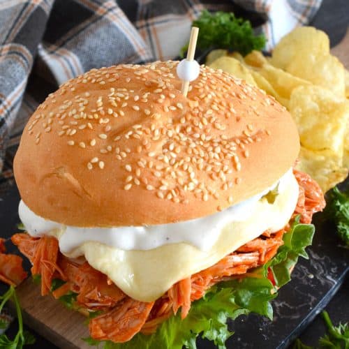 Leftover turkey never tasted so good! Shredded leftover turkey is tossed in a buffalo sauce and piled high onto your favourite sandwich bread or bun. Topped with melted cheese and dill pickles, this Buffalo Turkey Sandwich is simple, quick, and easy, yet it tastes absolutely incredible!
