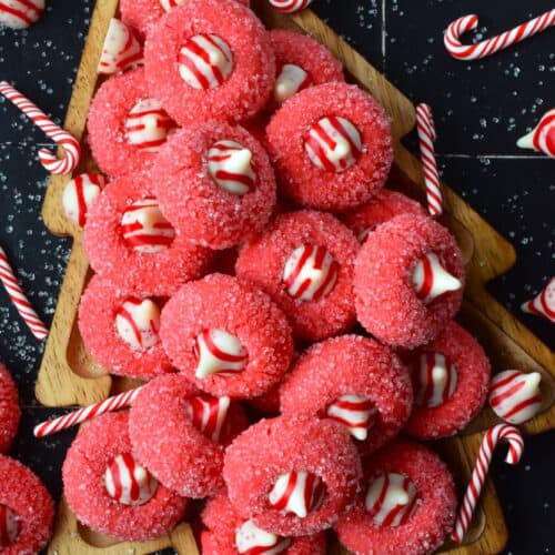 A deliciously decadent peppermint cookie, coated in sugar, and topped with a Hershey's white chocolate kiss, Candy Cane Hershey Kiss Cookies are a perfect holiday treat that everyone will love! These are quick and easy – no need to chill the cookie dough before baking either! Don't they look absolutely adorable!?