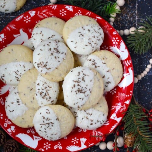 These tender, soft, and moist Caraway Christmas Cookies are prepared with a basic vanilla and caraway seed-flavoured cookie dough. Dipped in melted white chocolate and sprinkled with coarse sanding sugar and more caraway, these cookies are a great addition to any holiday cookie exchange or cookie platter!