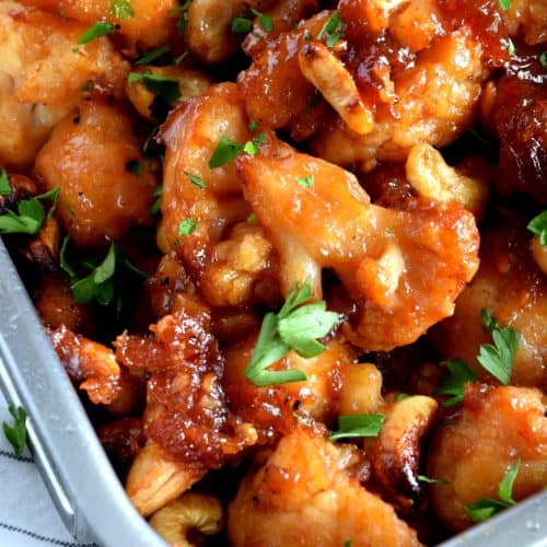 It is imperative that you shake off the excess cornstarch before attempting to bake the cauliflower. Once you have tossed the cauliflower with half a cup of cornstarch, depending on how big or small your cauliflower is, you might have an excess amount of cornstarch.