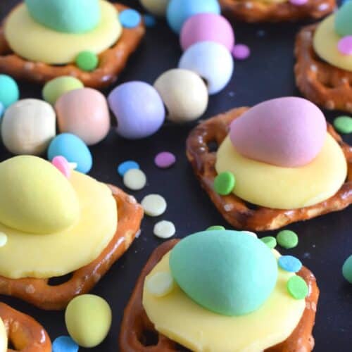 Oftentimes, these types of snacks are prepared with a large chocolate center, but to keep these Chickadee Pretzel Snack Bites as Easter-like as possible, use a yellow candy melt wafer instead! Top them with a Cadbury Mini Egg and festive sprinkles! Not only are they super cute, but they're also super delicious!