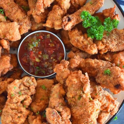 Steak is marinated in buttermilk and seasonings to tenderize and flavour before being double coated in a light batter. The steak is fried until golden and crunchy on the outside but is still moist and tender on the inside. Chicken Fried Steak Fingers have the flavour and crunch of fried chicken but with steak instead!