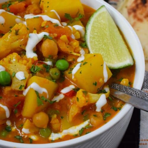 Chickpea Coconut Curry Soup is everything but bland; prepared with lots of vegetables, warming spices, and a fresh burst of lime juice, this soup is also vegetarian and vegan-friendly too! Serve with naan bread for a well-balanced, hearty meal!