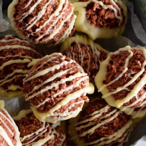 This next step with the white chocolate is completely optional. Add the white chocolate chips to a microwave-safe bowl. Melt on low heat in 10 second increments, stirring well between each increment. Once smooth, dip the bottoms of each macaroon into the chocolate, allowing the excess to drip off. Return the macaroon to the prepared baking sheet. Drizzle the remaining melted white chocolate over the top. Return to fridge for another hour or until the white chocolate is set.