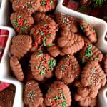 When it comes to baking with the purpose of gift giving, a Christmas Chocolate Spritz Cookie is the best way to go, especially if they have sprinkles! Everyone loves spritz cookies; they're so easy to make and one batch makes a lot of cookies!