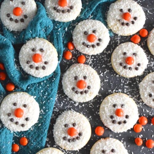 Coconut Snowman Cookies are simply adorable! They're also very easy to make, inexpensive, and delicious too! The base of the cookie melts in your mouth! Using mini chocolate chips for his eyes and mouth, and an orange candy-coated chocolate for his nose, these cookies are almost too cute to eat!