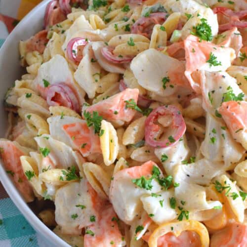 Flaked crab is paired with pasta and peppers in this Crab Pasta Salad. It is tossed in a creamy and tangy dressing made with mayonnaise, old bay seasoning, celery salt, and more. A great make-ahead salad best served slightly chilled with your favourite grilled beef! It's surf and turf - summer style!