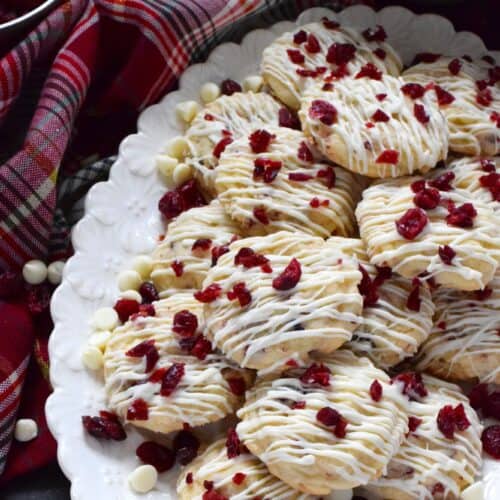 Cranberry White Chocolate Cookies are a simplified version of the seasonally popular bliss bar at Starbucks. Prepared with a light sugar cookie base which is packed with dried cranberries and white chocolate chips, these cookies are topped with a drizzle of white chocolate and even more dried cranberries.