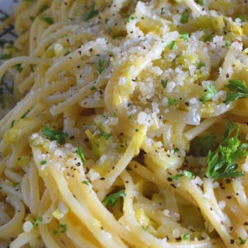 Sweet oniony leeks are paired with garlic, parmesan, and butter in this rustic and delicious Creamy Leek and Garlic Spaghetti. This recipe, although vegetarian, is hearty and filling and can be on your dinner table in thirty minutes or less!