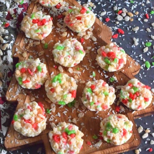 At this point, you can top them with a sprinkling of Rice Krispies. I only did this because I had Christmas-themed red and green Rice Krispies and I wanted the cups to be more colourful. Alternatively, you could use candy sprinkles too.
