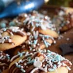 Once cookies are cooled, melt the chocolate chips in a double boiler. Transfer chocolate to resealable sandwich bag and cut a small hole in the lower corner. Drizzle the chocolate over the cooled cookies and top with sprinkles.