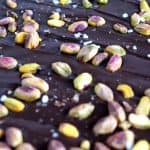 Next, sprinkle the pistachios evenly over the melted chocolate, followed by the sea salt.