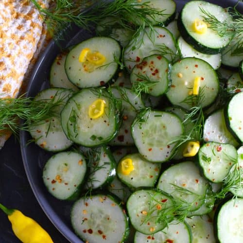 Toss cucumber slices with fresh dill fronds in a seasoned vinegar and lemon juice dressing to make this Dill and Cucumber Salad. It's light and refreshing with just the right amount of brightness and zing. Garnish with thinly sliced hot chilies for colour and heat.