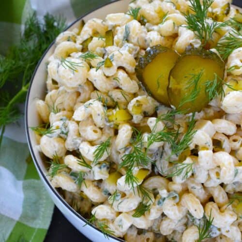 If it's going to be called a Dill Pickle Macaroni Salad, then it must be packed with lots of dill pickle flavour. That means combining the taste of fresh chopped dill with chopped dill pickles and a splash of dill pickle juice. This salad is so drunk will dilly flavour it will make your lips pucker!