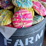 Once completely cooled, melt the candy melts and drizzle over the cookies. Top each cookie with sprinkles and allow the candy melts to firm up. Enjoy!