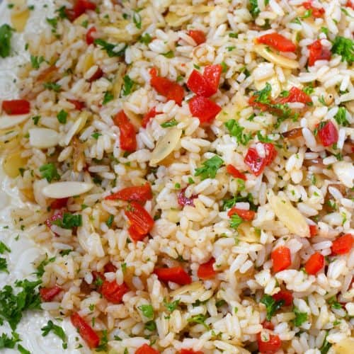 Transform inexpensive plain white rice into the most delicious holiday side dish! Prepared with fresh garlic and ginger, this rice is certainly aromatic. Tossed with caramelized onions, roasted red peppers, and blanched almonds, Easy Holiday Rice could just become a regular part of your holiday dinners!