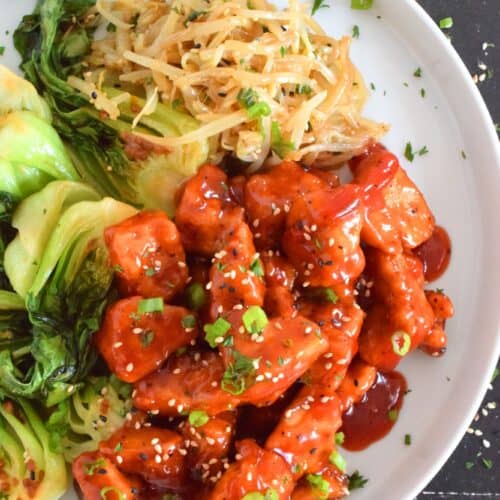 Extra firm tofu is seasoned and baked until lightly crispy on the outside with a slightly chewy, meatier inside. It is then tossed in a homemade sweet and sour sauce which makes this one of the most delicious ways to enjoy a baked tofu dish! If you think you don't like tofu, you obviously have not tried this recipe!