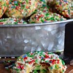 Use a small cookie scoop to portion the cookie dough into 1 1/2 tablespoon sized mounds. Gently roll the tops of the cookie dough mounds into the remaining sprinkles.