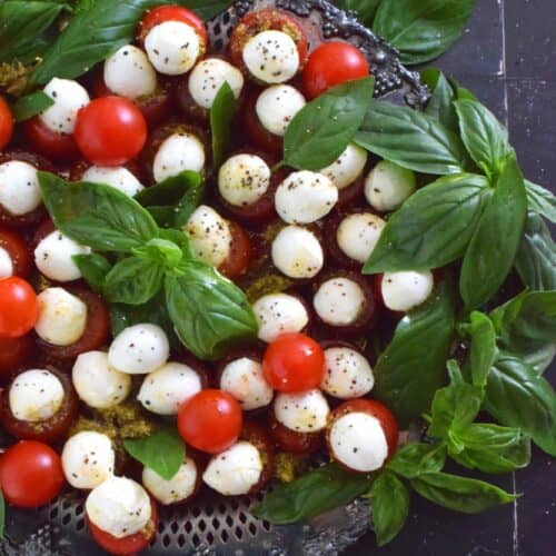 Simple, sweet, and cheesy!? You bet! This gorgeous Festive Caprese Wreath is easily prepared with hollowed-out cherry tomatoes stuffed with basil pesto and mini bocconcini. Sprinkle over some freshly ground black pepper, drizzle with olive oil, and tuck in some fresh basil leaves before serving!