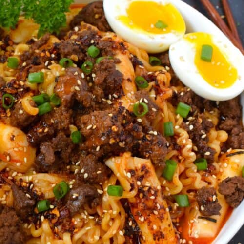 This dish has it all - noodles, ground beef, broth, soft-boiled egg, and even rice cakes! Firecracker Beef Ramen Noodles starts with a quick, easy, and spicy pan-fried ground beef that is paired with store-bought packaged ramen noodles and optional Korean rice cakes! This is one of those warm and cozy recipes perfect for a night in binging on your new favourite television series!