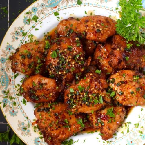 Moist and tender chicken thighs are marinated in an Asian-inspired sauce with garlic, ginger, soy, and green onions, and cornstarch. Pan-fried until crispy, the chicken is then drizzled with a homemade chili sauce that is easily prepared with brown sugar, chilies, vinegar, and sesame oil.