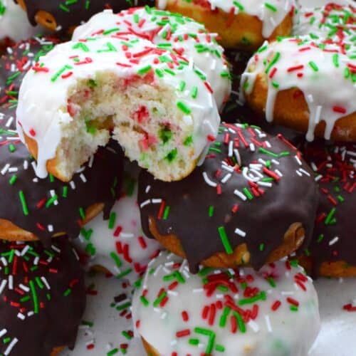 For the kid in all of us this holiday season let's make some Funfetti Christmas Donuts! This light and fluffy vanilla donut is filled with sprinkles and topped with a sugary, sweet glaze. Better than store-bought, these donuts make a lovely bring-along party treat as well!