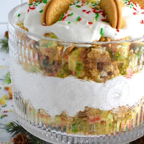Starting with a homemade vanilla funfetti cake, this Funfetti Golden Oreo Trifle is layered with light and fluffy whipped cream, festive sprinkles, and crushed Oreo cookies. Put a smile on everyone's face with this deliciously gorgeous and easy Christmas dessert!