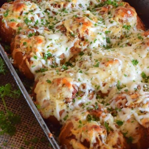 Garlic Bread Meatball Bombs are hollowed out dinner rolls which have been liberally smeared with homemade garlic butter. Each roll is stuffed with a meatball and sauce, then topped with cheese. Baked to a bubbling, gooey perfection, these bombs are the bomb!