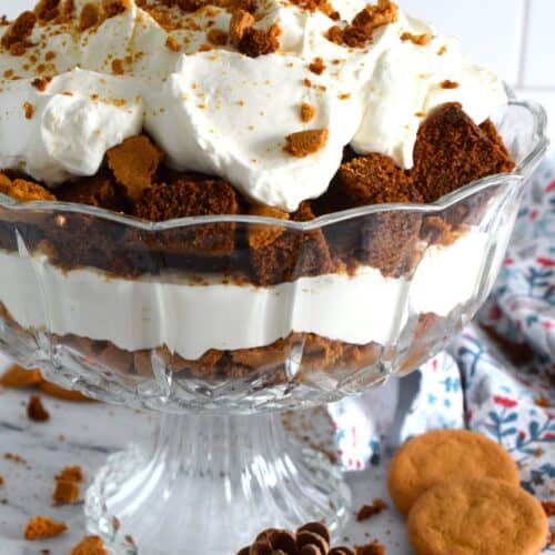 Homemade gingerbread cake makes up the bulk of this Gingerbread Trifle. Layered with fluffy whipped cream, crushed gingersnap cookies, and candied sugary ginger, this dessert is the perfect warm and cozy finish to a family holiday meal!