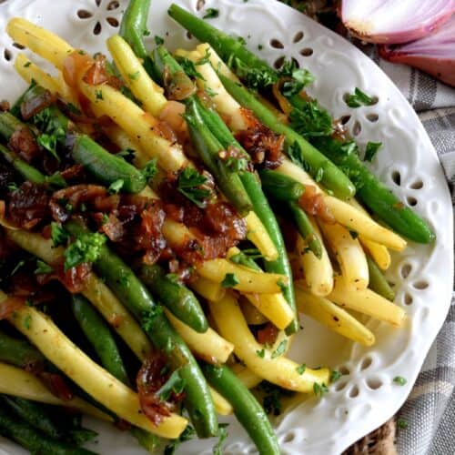 Beautifully and deliciously simple, Green Beans with Caramelized Shallots, is a fresh, light, and easy side dish alternative to the popular green bean casserole - no need for heavy creamed soup additives here!